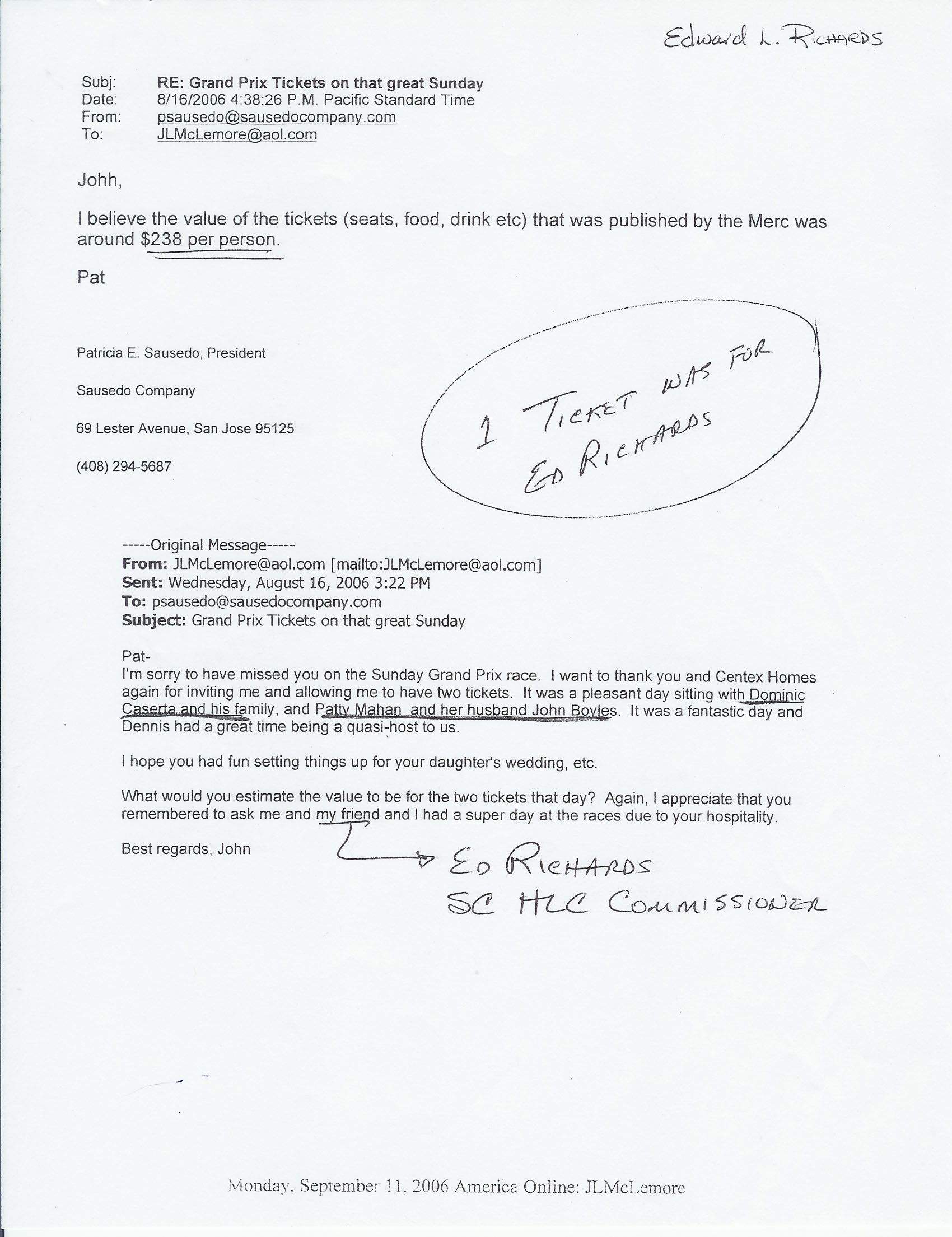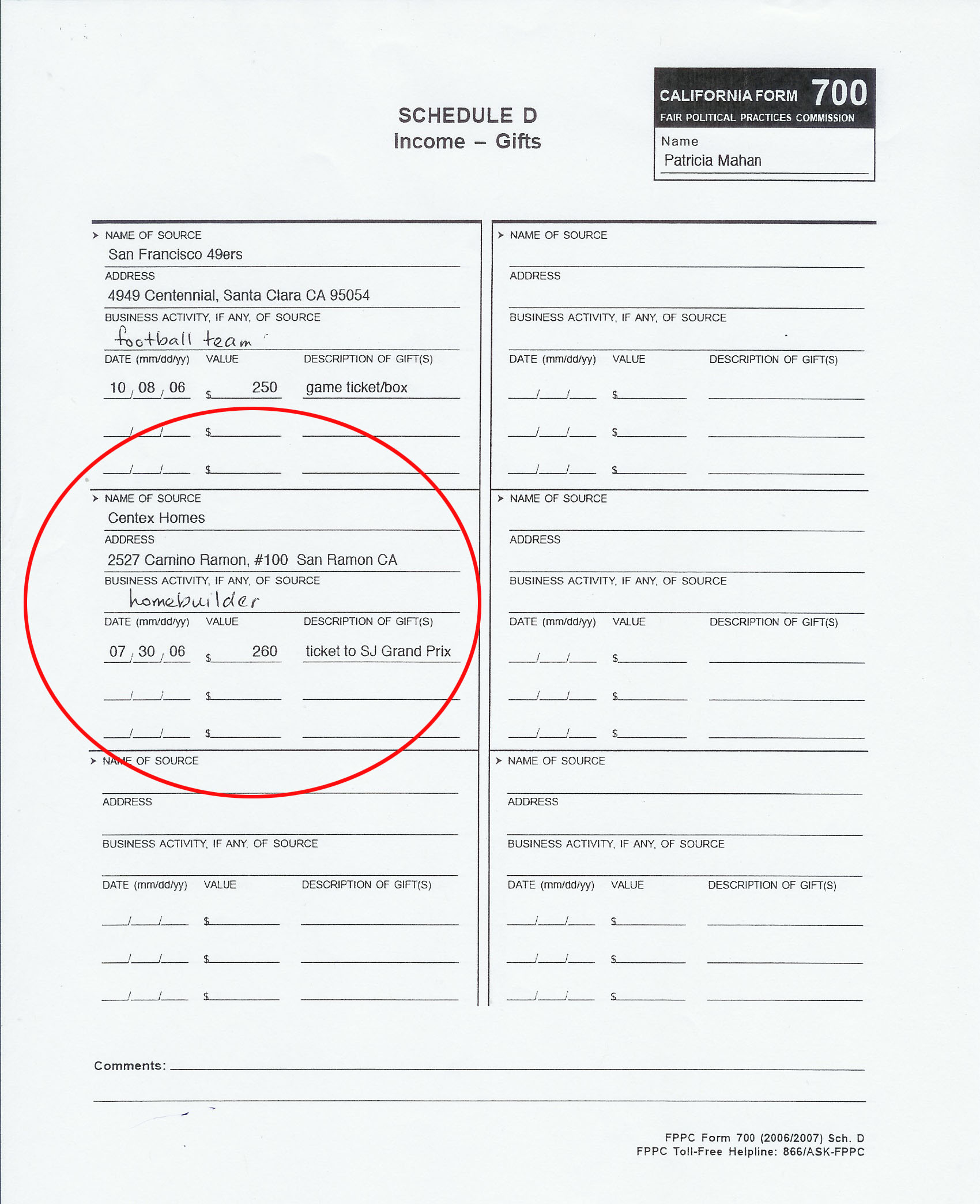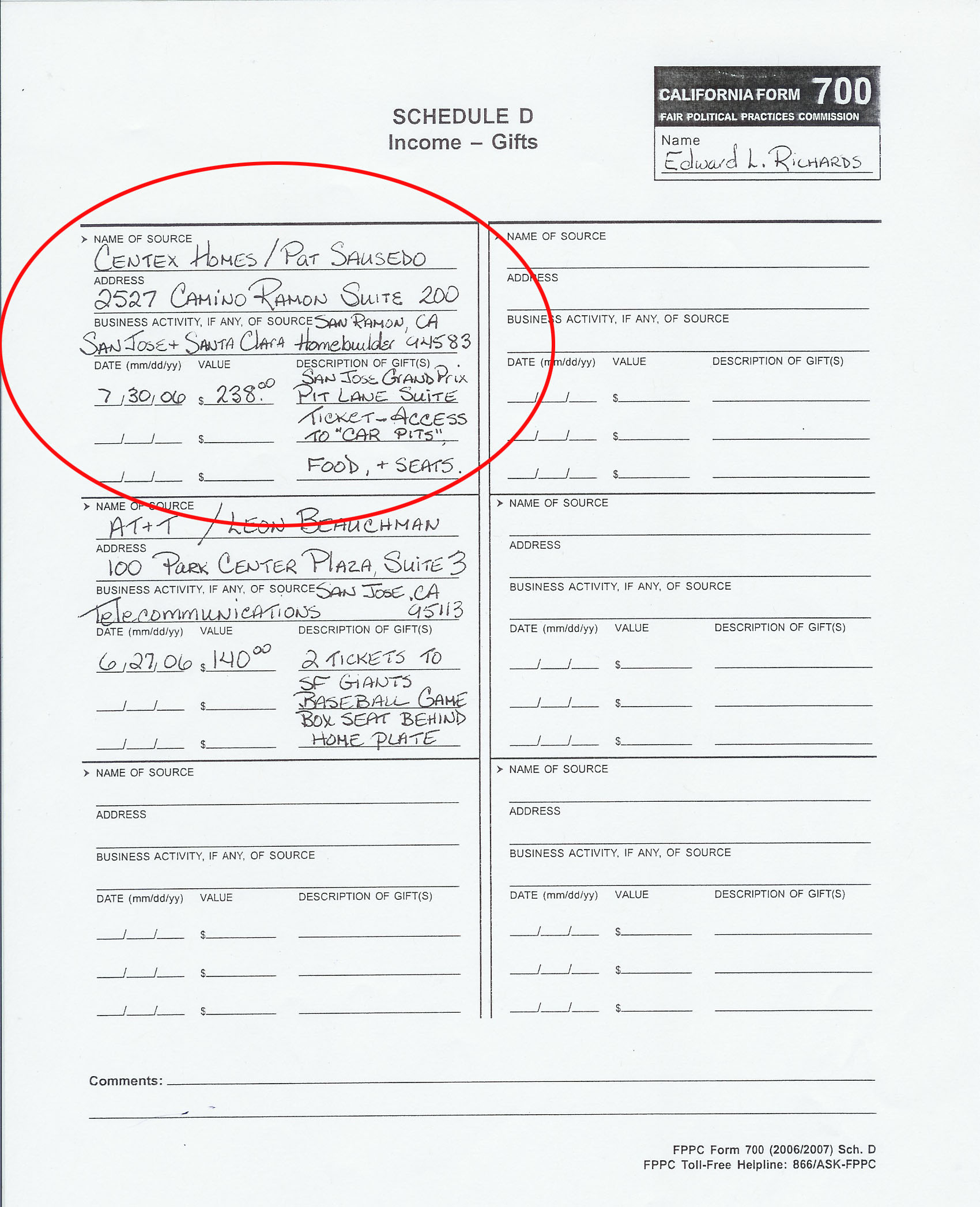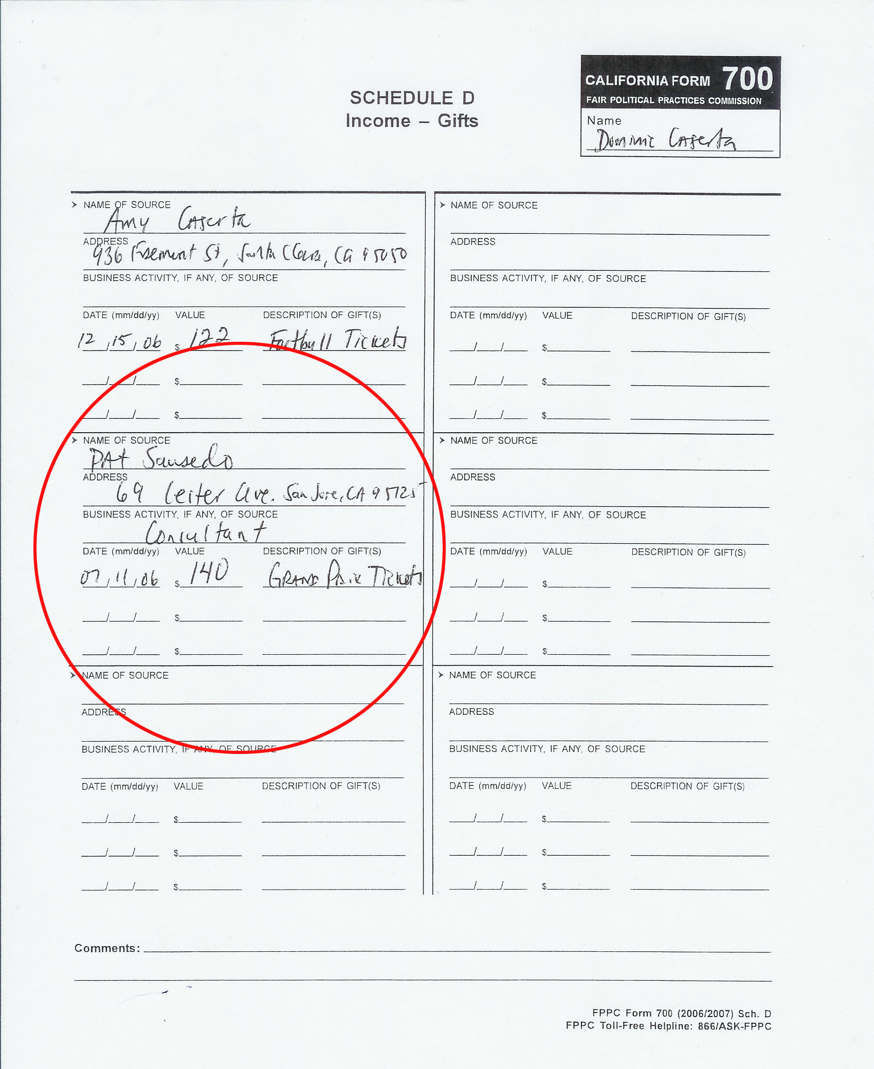 In researching Caserta's FPPC Conflict of Interest forms (Form 700), we noticed he did not provide accurate information about gifts he got from a housing developer, Centex Homes. He received multiple tickets to the 2006 San Jose Grand Prix and took his "family." However, on the form, he reports an individual "consultant" gave him the tickets. He reported $140. Each ticket was valued at $238 by the donor and he had more than one. Both Ed Richards of the Santa Clara Historical Landmarks Commission and Santa Clara Mayor Patricia Mahan reported Centex as the donor and each ticket was valued at $238 or more (it looks like Mahan made an error here too, but that is another story).